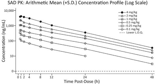 RR-HNK plasma concentration-time profiles from Trial 1. Reprinted from “A Phase 1 Assessment of the Safety, Tolerability, Pharmacokinetics and Pharmacodynamics of (2R,6R)-Hydroxynorketamine in Healthy Volunteers,” by S. M. Raja et al., 2024, Clinical Pharmacology & Therapeutics, 116(5), pp. 1314–1324 (https://www.doi.org/10.1002/cpt.3391). Copyright 2024 by the authors.