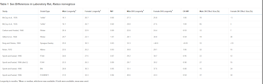 Until the 1990s, laboratory rats were the mammal of choice for most aging studies (Masoro, 1992). Unfortunately, most of those studies focused on males only. However, there have been lifespan studies of laboratory rats of both sexes under a variety of dietary and housing conditions. Most of these studies observed that females live longer than males (Table 1). However, in recent decades two-sex studies have grown rare, so most of what we know about sex differences in rat longevity stems from the time before specific-pathogen-free (SPF) animal colonies became the norm. Thus, it is never clear when infectious disease may have had an undue influence on a study’s outcome. For instance, McCay’s 1935 study of “white” rat longevity observed that female rats lived approximately 66% longer (!) than males when both were fed ad libitum (McCay et al., 1935). However, compared to other rat studies, the males (but not the females) in that study were exceptionally short-lived. Interestingly, when their diets were restricted in calories, the longevity difference was reversed. In two groups restricted either from weaning or 2 weeks after weaning, males lived 6% and 8% longer than females. Most studies since that time have found female rats to live longer than males, although the difference is not dramatic, ranging from a female survival advantage of roughly 2%–15% (Austad, 2011; Sprott and Austad, 1996; Swindell, 2012; Turturro et al., 1999). In particular, the NIA Biomarkers program raised thousands of rats of two inbred strains (F344 and Brown Norway) and one F1 hybrid in both ad libitum-fed and food-restricted conditions, including two different diets, and found that in all cases females lived slightly longer than males. Thus, females appear to have a slight survival advantage in multiple rat genotypes under a variety of conditions.