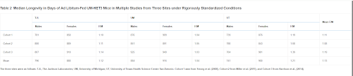Median Longevity in Days of Ad Libitum-Fed UM-HET3 Mice in Multiple Studies from Three Sites under Rigorously Standardized Conditions