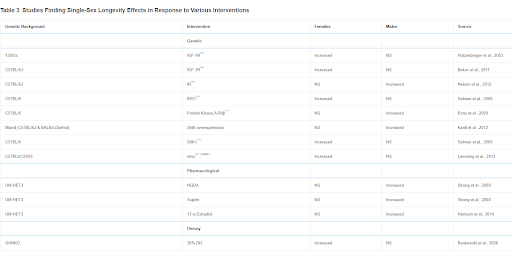 Perhaps even more surprising than the variability in sex differences in mouse longevity across diverse studies is the sex bias found in many interventions in longevity (Table 3) (Austad and Bartke, 2015). This table only includes studies in which a statistically significant effect was found in only one sex and not in the other. There are a multitude of additional studies in which the effect on one sex is substantially greater than the effect in the other, which we have ignored (e.g., Harrison et al., 2009). It is not difficult to imagine why dietary or pharmacological studies might differ between the sexes because of differential metabolism or clearance. This may be the case with NDGA and aspirin, in which blood levels of the active form of the drugs are significantly higher in one sex compared with the other, and could be the case for the other interventions reported to date by the ITP where, with the notable exception of rapamycin, lifespan is preferentially extended in males (Table 4) (Strong et al., 2008). It is more difficult to imagine why something like a genetic knockout—presumably just as knocked out in both sexes—would affect the sexes differently. As with sex differences in unmanipulated mice, there may be a considerable amount to be learned from further investigation of these cases.