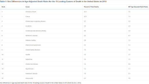 Sex differences in age-adjusted death rates for the 15 leading causes of death in the United States in 2010 (from Xu et al., 2016).