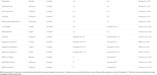 With the exception of rapamycin, interventions preferentially increased longevity in male mice. ∗Numbers are percent life extension of mean lifespan (life expectancy at start of treatment). ∗∗Survival curves reported before study completed; results provisional.